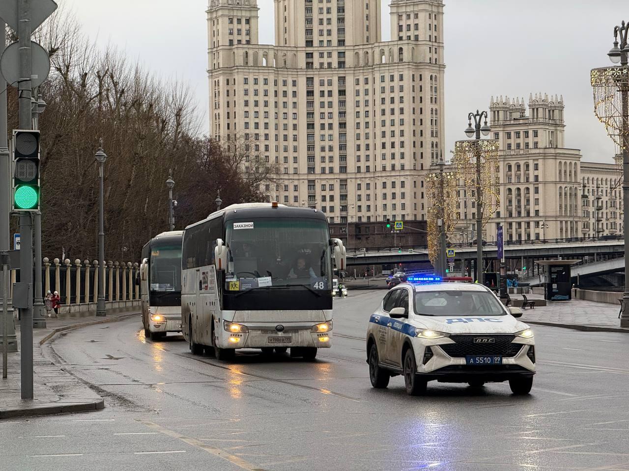 Как стало известно, по перекрытым набережным под охраной полиции проследовала колонна специальных автобусов с номерами различных российских регионов. На машинах размещены наклейки, предупреждающие о перевозке детей, а на лобовых стёклах видны пропуска для въезда на территорию Кремля.